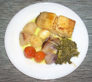 Quanto às entradas, paio do lombo de Vila Flor, salmão escocês fumado, dois patés (pois e tal, assim não dá trabalho nenhum) e tomate cortado em cubos regado com um fio de azeite, oregãos, flor de sal e queijo de ovelha curado ralado que vai ao microondas (tinha que ser) a gratinar ligeiramente; com as entradas bebeu-se um belíssimo Domingos Soares Franco Colecção Privada Moscatel Roxo Rosé 2007 (pois, tem um nome comprido mas é uma maravilha).