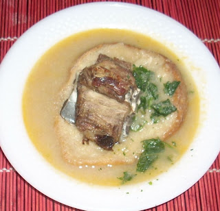 Já nos pratos deitei uma fatia de pão levemente torrado, o caldo e um osso, bem como um bocadinho de hortelã.