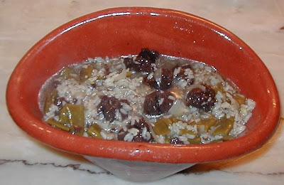 No tacho de barro, deitei cebola e um fio de azeite; juntei o chouriço e deixei estufar um pouco. Juntei água a ferver e o feijão cortado e deixei cozer um pouco. Juntei o arroz e quando estava a dois terços do tempo da cozedura rectifiquei temperos (na verdade temperei com uma pitada de sal, porque não tinha deitado nada e também de mais nada precisou) e deitei num púcaro de barro, deixando acabar a cozedura no forno a 170ºC.