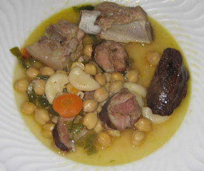 Colocamos as carnes a cozer (rabo de porco, costela, um pouco de entremeada, uma chouriça de carne e uma morcela de sangue) . A morcela, depois de cozida, foi salteada em azeite e servida à parte para respeitar gostos diversos dos comensais e potenciar a flexibilidade sápida do prato.