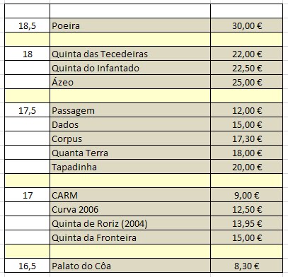 Continuando a “brincar”, considerei como razoável o valor de € 30,00 para o vinho classificado com 18.5 valores e fui à procura de vinhos que fossem ficando mais baratos € 5.00 nos grupos seguintes, ou seja:
