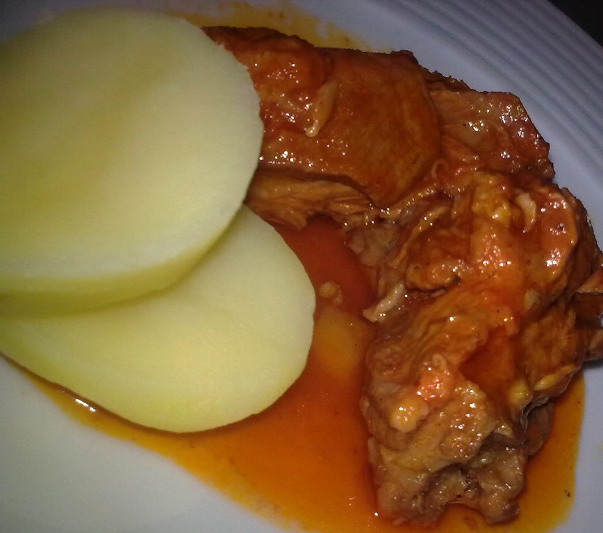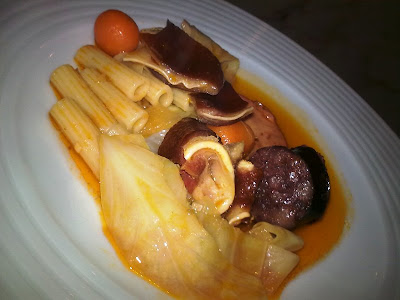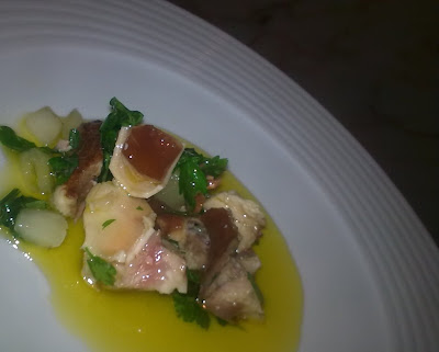 Carne de porco (o Luís usou lombinhos) dupla e longamente marinada... Primeiro fica 24 horas em azeite, depois numa mistura de vinho, alhos, massa de pimentão e vinagre durante 3 a 4 dias e que depois é grelhada | frita na chapa. Pareceu-me uma proposta bastante interessante, ao ponto de a ensaiar...