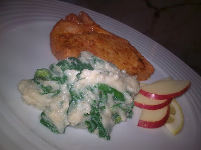 Num tacho, deitei água e um pouco de sal marinho e quando a água estava a ferver, juntei os grelos. Dei-lhes apenas uma entaladela, retirei parte da água e juntei farinha de milho. Reduzi o lume para o mínimo e fui mexendo até a farinha estar cozida. Desliguei o lume, juntei um fio de azeite e reservei. Entretanto, já tinha retirado a carne do frigorífico e tinha-a metido no grelhador, sem qualquer adição de gordura... Deixei a carne alourar por fora, dos dois lados e depois reduzi o lume e deixei ficar até a carne estar macia. Servi com maçã e uma mini rodela de limão.