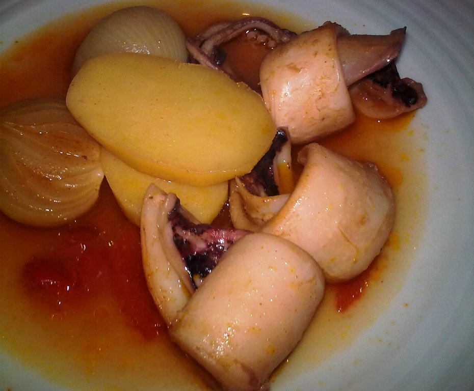 Esta minha preparação é muito simples e não se compara com a riqueza de sabores texturas e aromas de uma caldeirada de peixe, mas ainda assim constitui uma forma interessante de preparar umas lulas. Num tacho de fundo grosso deitei um fundo de azeite. Juntei as lulas, batatas, cebolinhas novas cortadas ao meio e pimento vermelho em fatias. Cobri com água, juntei um pouco de polpa de tomate (à falta de tomates bem maduros, mais vale usar a polpa), um pouco de pimenta branca, uma folha de louro, um pouco de pimentão doce em pó e dois dentes de alho esmagados. Levei a lume brando até as lulas estarem cozidas e servi. Normalmente as batatas são a ultíma coisa a cozer, mas se cozerem rápido (depende da variedade do tubérculo) pode-se juntar um pouco de vinho branco. As batatas não se desfazem e o resto continua a cozer.