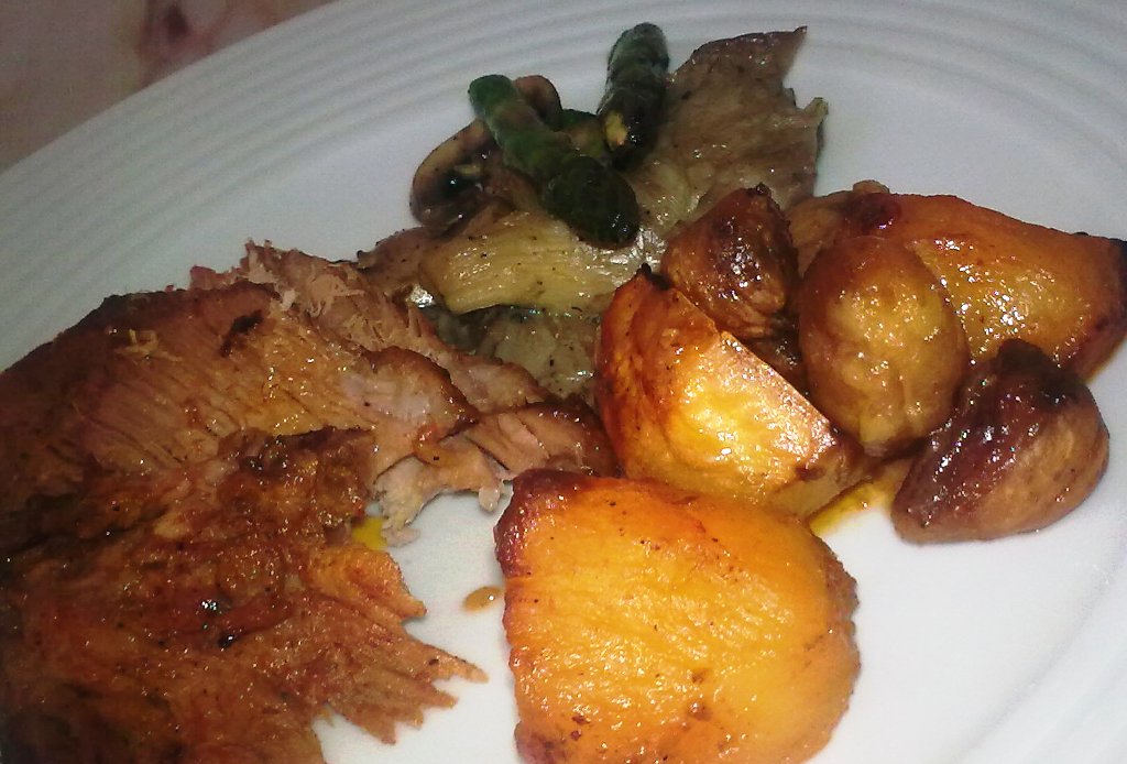 Normalmente nos meus assados gosto de barrar a carne com uma mistura feita com banha de porco, sal, pimenta e alho, os ingredientes básicos do molho do leitão. Aqui resolvi variar um pouco e barrei um naco de cachaço de porco com uma mistura de massa de pimentão, azeite, sal, alho e pimenta. Deixei umas horas e levei ao forno a 170º C num tabuleiro, juntamente com umas batatas descascadas e cortadas em quartos e castanhas. No fundo do tabuleiro juntei apenas um pouco de vinho branco. Para acompanhar, salteei uns cogumelos (champignons e pleurotus) e uns espargos em azeite e um pouco de alho e sal. Servi a carne cortada em fatias finas. Uma variante que saiu bem e que vou fazer mais vezes.