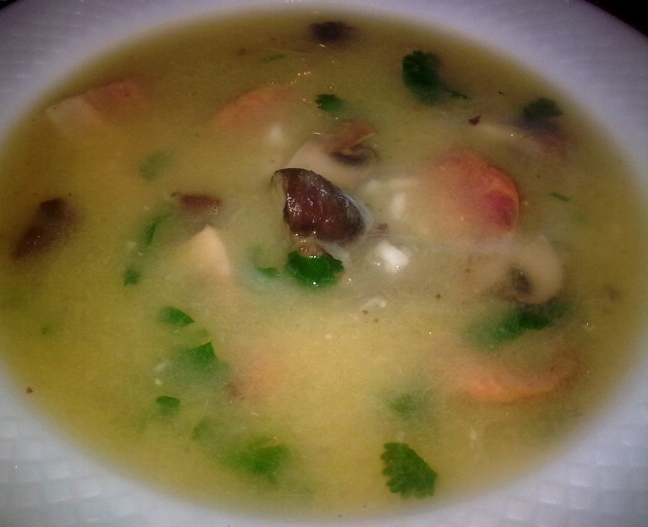 Apesar de ter sido feita com uma base de carne e enchidos e ter levado arroz (muito pouco) e cogumelos, a delicadeza do sabor do alho francês e a frescura dos coentros frescos compuseram uma sopa muito equilibrada.
