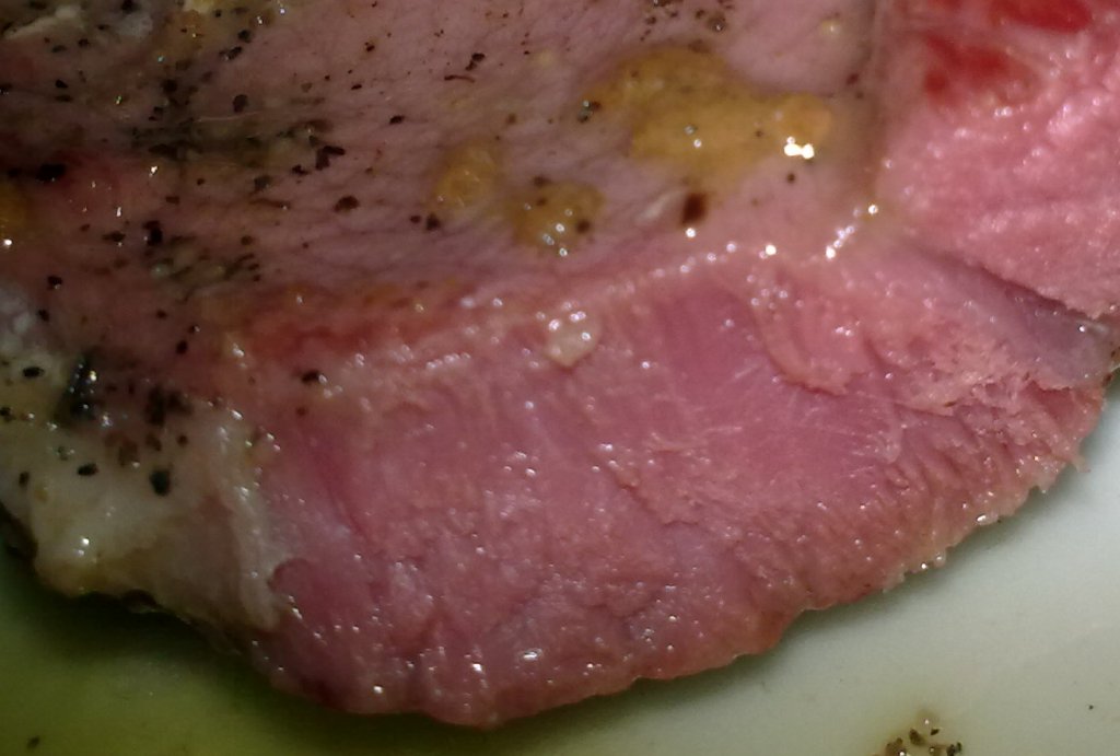 Tomem-se fatias de presunto grossas (com a espessura de um dedo, ou seja, a rondar o centímetro e cada uma com cerca de 150 g) e demolhem-se de um dia para o outro (com os actuais presuntos industriais correntes, meio dia é mais que suficiente). Depois, sequem-se e batam-se. Temperem-se com pimenta preta (tradicionalmente em grão e eu usei moída, cruxificainde-me), louro (também não tirei os veios tóxicos, cruxificainde-me) e alho esmagado e deixem-se umas horas a tomar o tempero.
