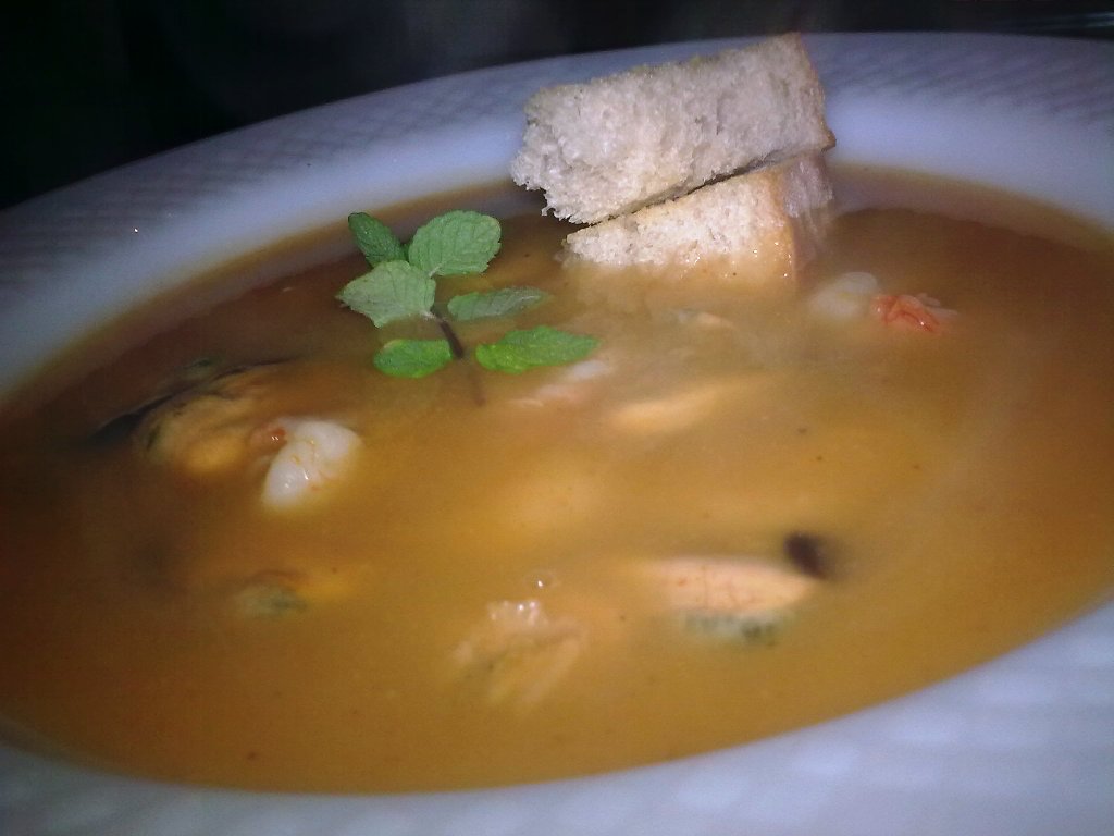 Para começar, um Creme de Marisco, feito com camarões, mexilhões e ameijoas. Cozi os mariscos, tirei os mexilhões e as ameijoas das cascas e descasquei os camarões. Reservei. Juntei as cabeças dos camarões à água da cozedura e deixei em lume brando durante perto de uma hora para melhor extraír os sabores. Num tacho, deitei um fundo de azeite, um dente de alho esmagado, uma cebola picada e deixei a cebola ficar translúcida. Adicionei polpa de tomate e deixei refogar ligeiramente em lume brando; juntei o caldo da cozedura dos mariscos, passei a varinha até obter um creme e juntei os mariscos reservados. Temperei com sal e pimenta branca qb. Servi com uns tocos de pão torrado e umas folhas de hortelã para refrescar.