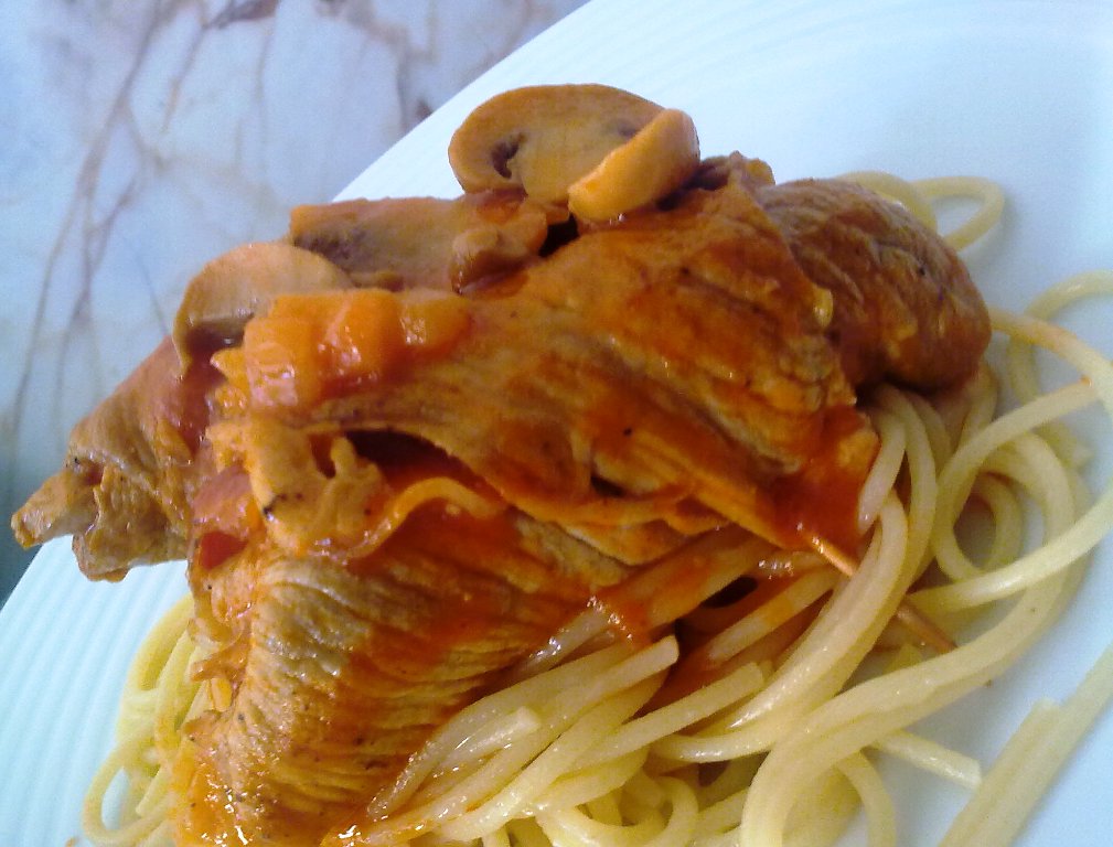 Um prato banal e inspirado nos estereótipos da cozinha Mediterrânica e Italiana, mas que se revelou delicioso. Uns simples escalopes da perna do porco que cobri com uma tira de presunto e queijo de São Jorge e que enrolei. Fechei-os com um palito, alourei-os em azeite e reservei. Piquei uma cebola para um tacho de fundo grosso, juntei um pouco de alho esmagado, o azeite onde alourei os bifes enrolados e levei o tacho a lume brando até translucidar a cebola. Juntei polpa de tomate, pimenta preta, uma folha de louro e os bifes. Deixei em lume brando cerca de uma hora. Juntei champignons de Paris cortados em fatias finas, deixei uns cinco minutos, desliguei o lume e deixei harmonizar os sabores. Acompanhei com esparguete cozido al dente em água e um fio de azeite e aromatizado com queijo de São Jorge ralado e uma salada de verdes (e vermelhos)...