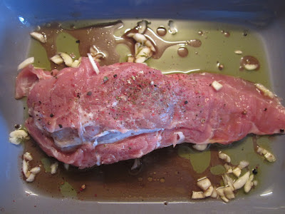 Peguei num lombinho de porco e recheei-o com ameixas secas que tinha deixado uma hora a macerar em vinho do porto (aconselho que não se use um banal tawny, mas antes um tawny reserva ou mesmo um de dez anos de marca própria - o do Pingo Doce é porreiro e barato). Deitei um fio de azeite no fundo de um tabuleiro de grés, o lombinho, o vinho do porto da marinada das ameixas, pimentas moídas, sal marinho e alho esmagado.