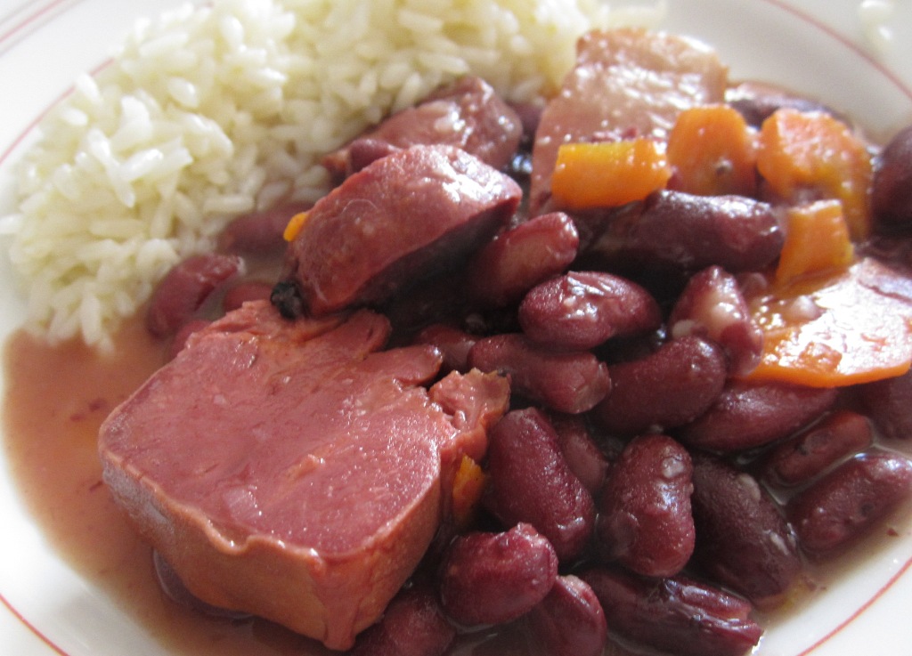 Já não encontrava língua de porco fumada há bastante tempo. Encontrei, comprei e resolvi fazer uma feijoada. Cozi a língua, um pedaço de bacon e um chouriço e reservei. Deitei um fundo de azeite num tacho, uma cebola picada, um dente de alho esmagado, uma folha de louro, uns grãos de pimenta preta esmagados e uma malagueta e deixei refogar. Juntei uma cenoura em rodelas finas, feijão vermelho cozido, um pouco da água do feijão e um pouco da água de cozer as carnes, as carnes cortadas e deixei em lume muito brando durante uns vinte minutos. Servi com um arroz de alho.