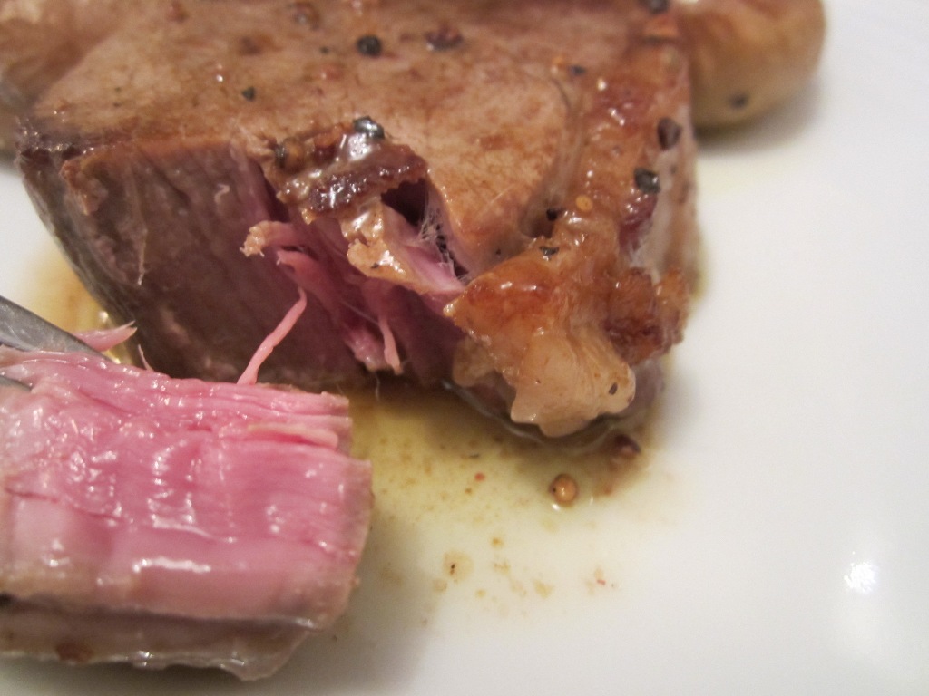 Carne no ponto, dourada por fora e bem rosada e suculenta por dentro.