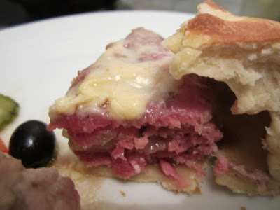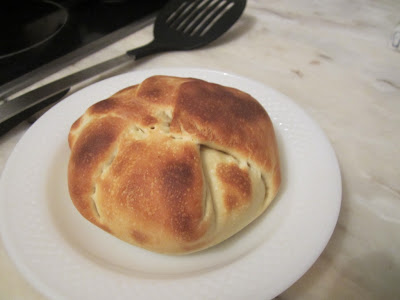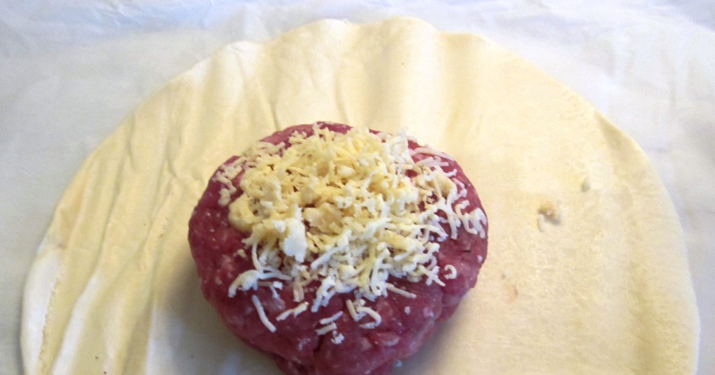 Comprei um pedaço de pojadouro de vitela no talho e pedi para o passarem no moinho de carne. Já em casa, temperei a carne com flor de sal, pimenta preta e um pouco de alho picado. Moldei metade da carne em forma de hambúrguer e deitei-lhe um pouco de queijo de ovelha por cima. Juntei o resto da carne, moldei em forma de duplo hambúrguer e deitei a carne em cima duma base de pizza pré-preparada. Ralei um pouco de queijo de São Jorge e deitei-o por cima da carne. Dobrei a massa por cima da carne e compus um pão. Levei ao forno a 150º C com o ventilador ligado durante cerca de quinze minutos, tempo suficiente para cozer a massa e derreter o queijo sem secar a carne.