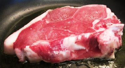 Um fio de azeite na frigideira a aquecer e estando bem quente, junte-se-lhe uma costeleta de vitela. Deixa-se um pouco menos de um minuto e vira-se.
