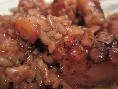 Deitei um fundo generoso de azeite num tacho de fundo grosso e juntei uma cebola picada grosseiramente, dois dentes de alho esmagados e picados, uns grãos de pimenta esmagados no almofariz, uma folha de louro e uma malagueta seca. Deixei que a cebola ficasse transparente e baixei o lume. Deixei em lume brando uns cinco minutos e juntei o arroz (duas chávenas de arroz carolino). Envolvi tudo, voltei a subir o lume e deixei o arroz fritar um pouco. Juntei então água da cozedura do polvo (o triplo do volume do arroz) e quando levantou fervura, baixei o lume para o mínimo e deixei cozer durante doze minutos. Desliguei o lume, juntei um pouco de vinagre de vinho tinto, envolvi e deixei uns minutos a harmonizar sabores antes de servir.
