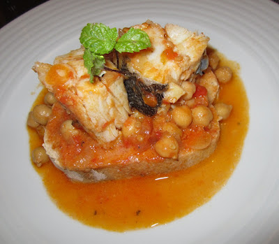 Comecei por picar uma cebola e esmagar uns dentes de alho que levei ao lume médio num tacho de fundo grosso. Mexendo sempre, juntei pimenta preta esmagada no almofariz, uma folha de louro, tomate coração de boi cortado em cubos e um pouco de pimento vermelho. Deixei refogar uns minutos e juntei grão cozido e vinho branco a cobrir. Deixei estufar em lume muito brando durante meia hora. Depois juntei bacalhau em cubos, desliguei o lume e servi passados cinco minutos, sobre uma fatia de pão e com um raminho de hortelã a enfeitar.