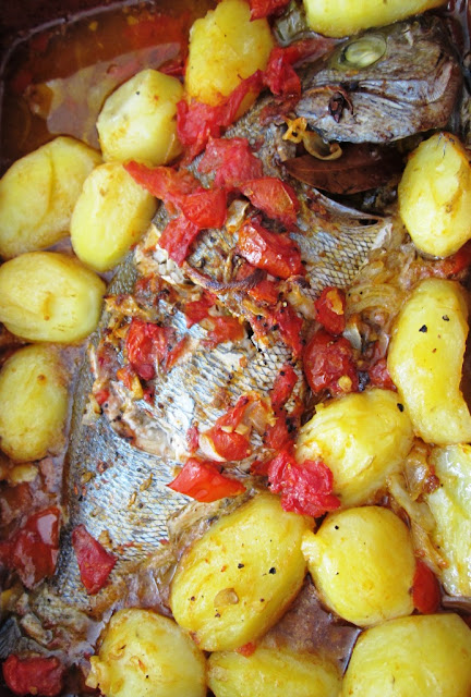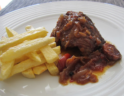 Aqui há umas semanas ensaiei uma vitela feita no forno em tacho de barro e achei que merecia ser repetida com umas pequenas alterações, basicamente com a inclusão de um tomate coração de boi cortado em cubos e umas tiras de pimento vermelho. Em vez de cubos de barriga de porco fumada, juntei umas rodelas de chouriço de porco preto. Para acompanhar, umas batatas fritas em palitos.