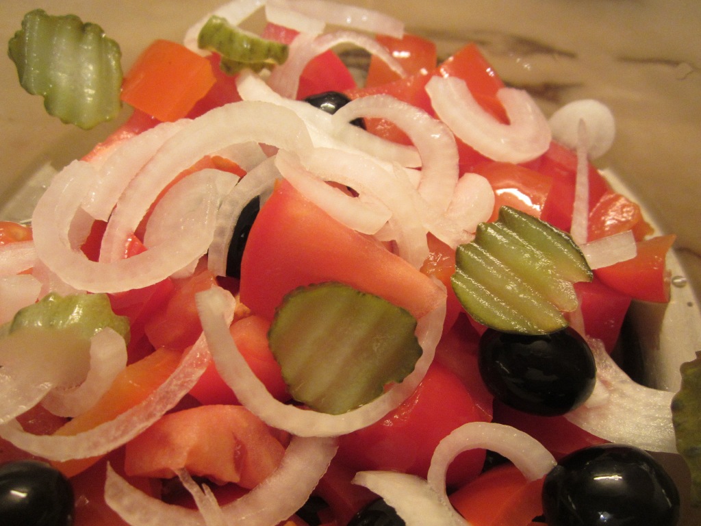 Para acompanhar, uma salada feita com tomate, pimento de conserva, pepino em vinagre, cebola e azeitonas, temperada com flor de sal e azeite.