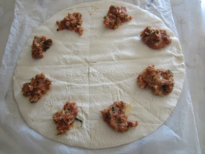 Este é um singelo aproveitamento de sobras de cozido, a saber, um pedaço de chouriço, outro de barriga de porco fumada e ainda outro de farinheira. Passei as carnes pelo moinho de carne (na falta de moinho, podem picar-se grosseiramente com uma faca; a picadora ou a bimby transformam a carne numa massa imprestável, pelo que serão de evitar), juntei um pouco de cebola e de salsa picada e dividi em pedaços grosseiros que espalhei sobre uma base de massa folhada de compra previamente dividida em oito partes.