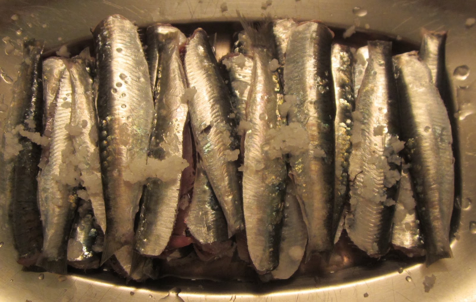 Petingas fresquíssimas, limpas de tripas, rabos e cabeça. Ficaram meia hora a tomar sal, foram passadas por água, secas com papel de cozinha e fritas em azeite até ficarem bem crocantes, como um torresmo.