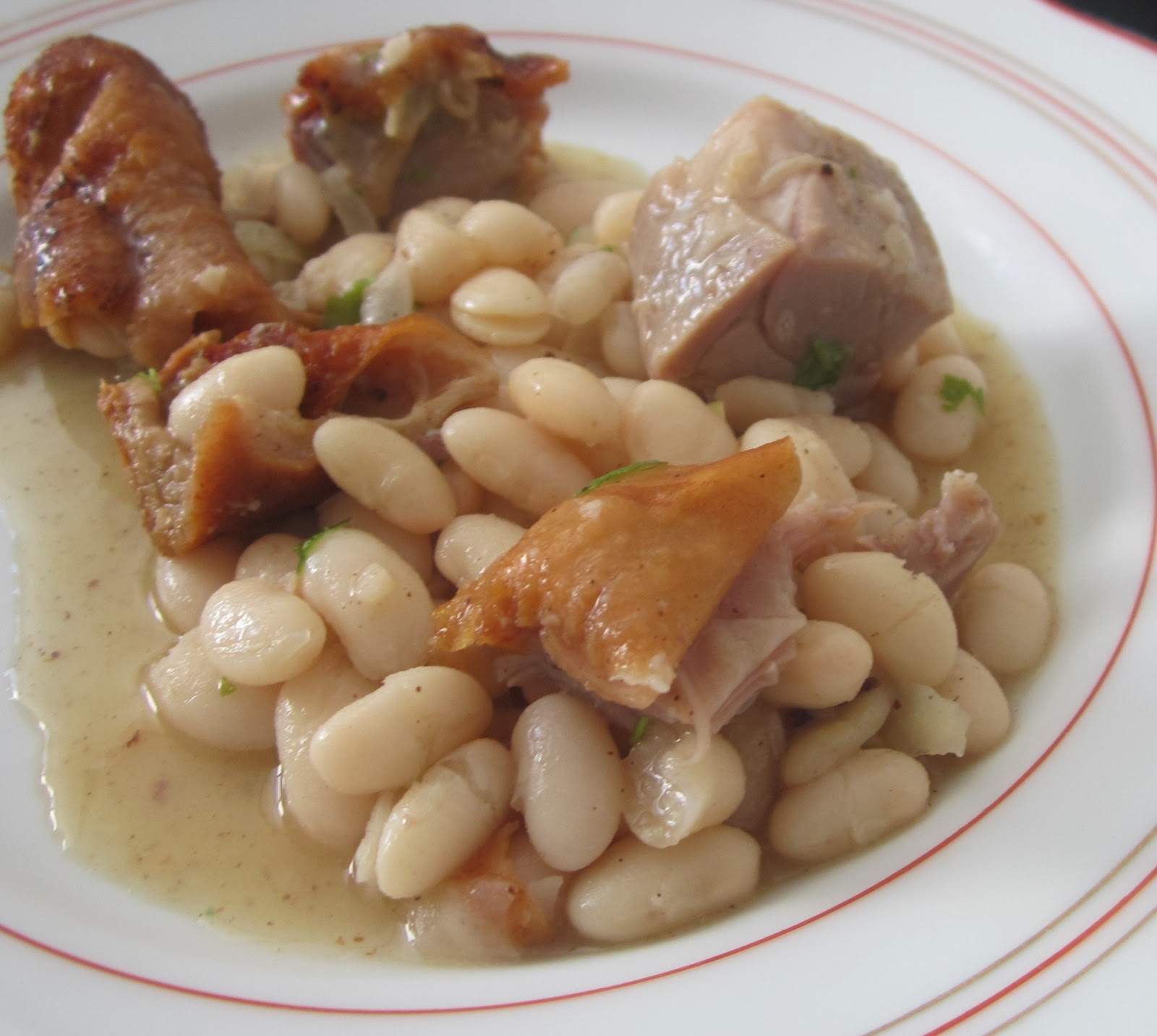 Fiz a receita mais ou menos conforme indicado, mas com grão da lata e um pouco de barriga fumada em vez do toucinho. O toque final dos cominhos e do azeite em cru é fantástico.