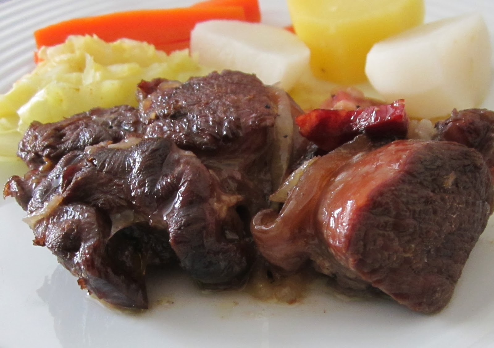 Tacho de barro, fundo de azeite e um pouco de banha de porco, sal, pimenta, uma folha de louro, cebola em meias luas finas, dois dentes de alho esmagados, uma malagueta e um pouco de barriga de porco fumada. Deita-se a carne por cima, adiciona-se um pouco de vinho tinto e cobre-se com vinho branco. Vai ao lume brando até a carne ficar macia. Tira-se a tampa ao tacho e leva-se ao forno pré aquecido a 180º C até dourar. Servi com legumes cozidos.