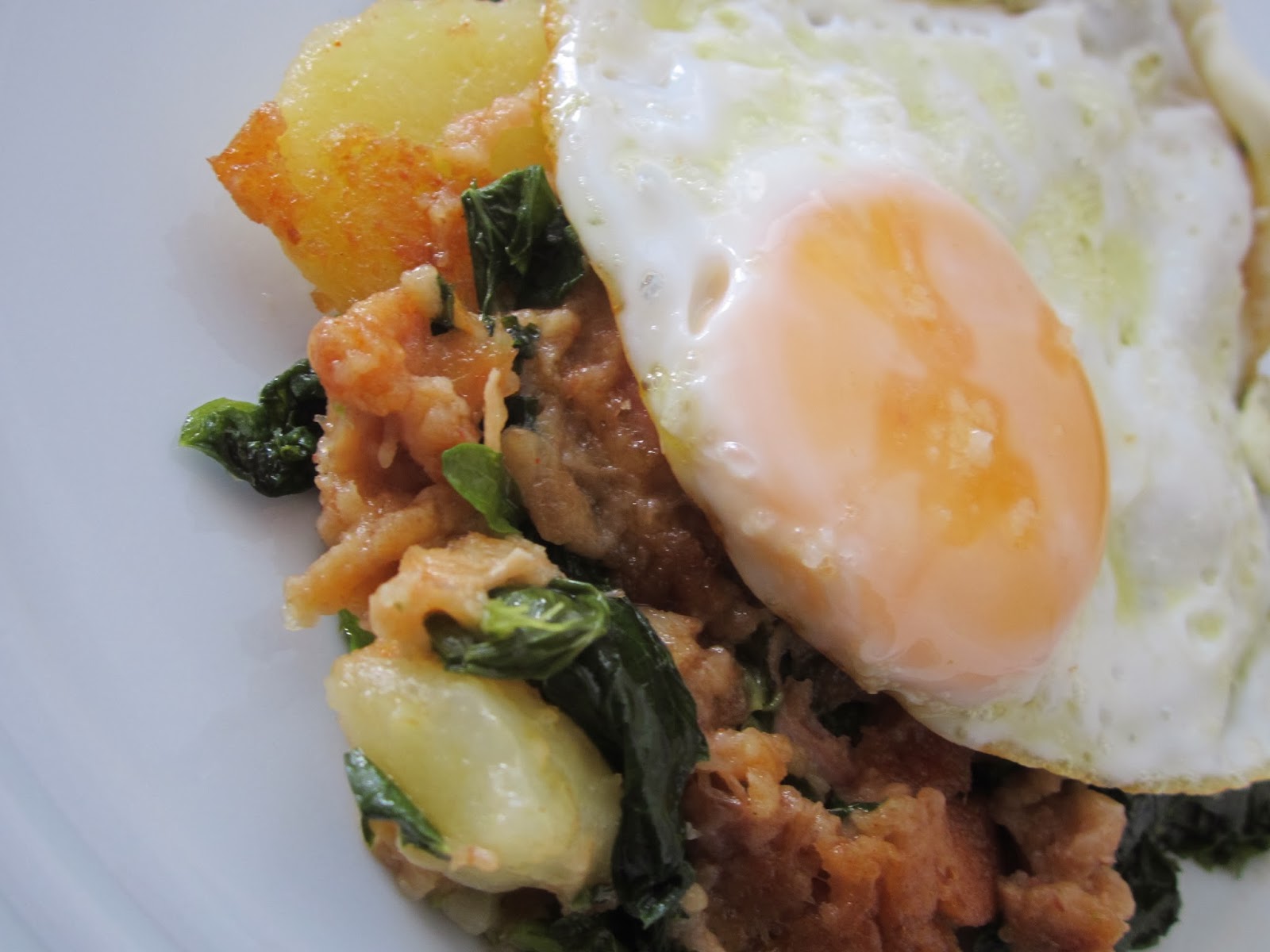 Comecei por cozer batatas com a pele (as batatas devem sempre entrar no tacho com a água ainda fria, para cozerem de modo uniforme) e escalfei um molho de grelos depois de devidamente arranjados. Descasquei as batatas e cortei-as em pedaços. Cortei os grelos grosseiramente. Tirei a tripa a uma alheira e parti-a em pedaços. Levei uma frigideira com fundo anti aderente a lume médio com um fio de azeite e adicionei a alheira. Fui mexendo durante cerca de cinco minutos. Juntei então as batatas e fui envolvendo tudo até as batatas começarem a dourar. Adicionei os grelos à mistura, baixei o lume e voltei a envolver tudo com uma colher de pau. Retirei do lume, tapei e deixei a harmonizar sabores, enquanto estrelava um ovo em azeite.Servi, com o ovo por cima, como se fosse a cereja no topo do bolo :)