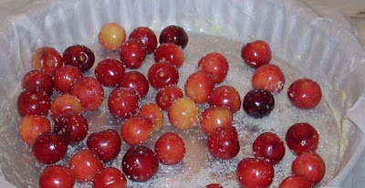 Espalhar as cerejas pela forma. Verter a massa sobre as cerejas.