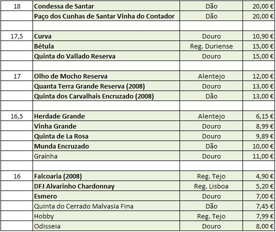 Os três vinhos que atingiram a classificação mais alta (18) são oriundos do Dão. Condessa de Santar e Paço dos Cunhas de Santar Vinha do Contador, com um PVP recomendado de € 20,00 e o Primus da Pellada, de Álvaro de Castro com PVP recomendado de € 25,00. É pena que os preços de referência dos Produtores não sejam sempre correctos. No caso destes 3 vinhos, os dois vinhos da Dão Sul podem ser adquiridos nas lojas da Empresa a cerca de € 14,00 e o Primus da Pellada está nos Jumbos a mais de € 33,00.