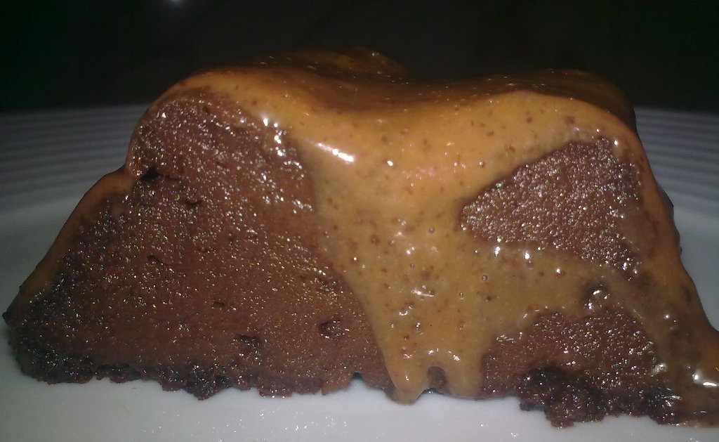 Para a cobertura, levei um pouco de leite condensado cozido a lume brando e juntei um pouco de cacau em pó. Mexi bem, desliguei o lume e cobri o bolo. Ficou assim, com uma bela textura...