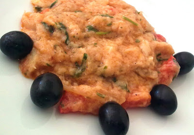 Digo espécie, porque esta açorda não foi feita simplesmente com o pão aromatizado no caldo de cozer o peixe a desfazer-se no azeite aromatizado com alho. Na verdade, nesta variante, levei um tacho ao lume com um fundo de azeite e alho esmagado e juntei uma cebola em rodelas finas. Deixei que a cebola ficasse translúcida e adicionei um pouco de pimento vermelho em tiras finas e um tomate em pedaços pequenos. Deixei tudo em lume brando enquanto limpei uma posta de bacalhau de peles e espinhas e embebi umas carcaças já secas em água a ferver. Juntei o pão, um ar de pimenta preta e um pouco de pimentão doce e fui mexendo pacientemente, até a açorda estar homogénea. Depois juntei o bacalhau lascado e um pouco de salsa e envolvi tudo. Desliguei o lume, esperei uns minutos, voltei a envolver a açorda e servi, com umas azeitonas pretas.