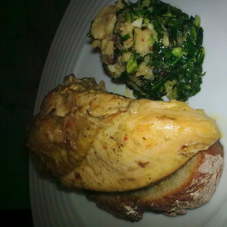 Resolvi fazer umas migas com boa broa de milho e couve galega. Outro tacho, mais azeite, um dente de alho esmagado e cortado, a broa partida em pedaços pequenos e couve galega cortada quase como se fora para caldo verde. Um pouco de água para hidratar a couve e vai de mexer em lume médio, até harmonizar sabores (não queria uma papa). Já agora e para que a broa tivesse dois momentos no prato e para eu, se quisesse, chamar ao prato, galinha de caril com broa em dois momentos, resolvi servir um supremo da galinha sobre uma fatia da mesma broa, aqui com um pouco do molho de caril. Servi assim, sem mais e ainda estou a pensar que algumas harmonizações pouco canónicas, dão pratos interessantes, como este...