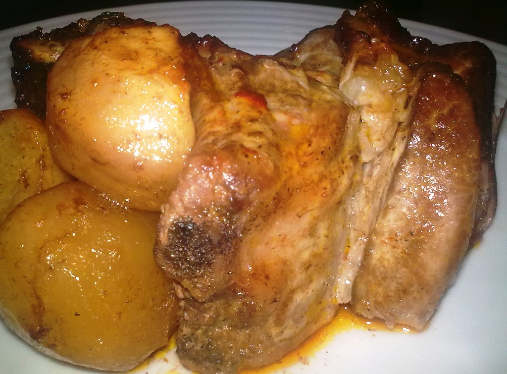 Acompanhei-o com um naco de lombo de porco com osso no forno e respectivas batatas que se mostraram uma excelente companhia para o vinho.